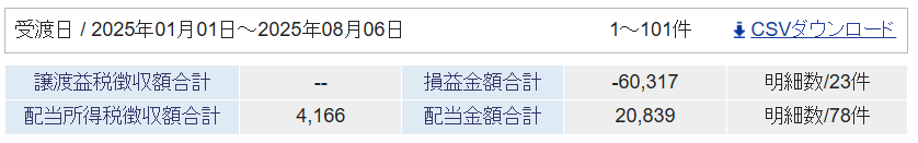 SBI証券の特定口座の実現損益や配当金の受取の状況