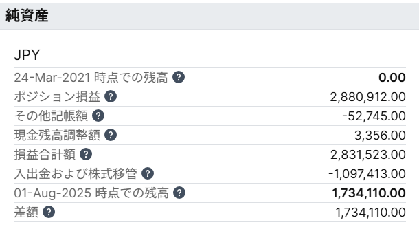 「損益合計額」の数値2,831,523円は、2021年3月25日からの累計の実現した損益と評価損益の合計金額です。