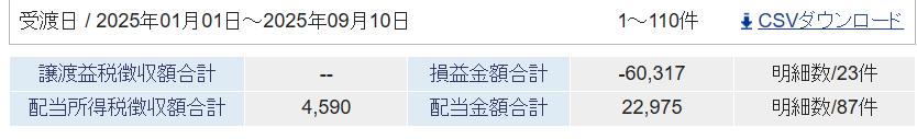 2025年の確定損益と配当金の受取額は以下の通りです。