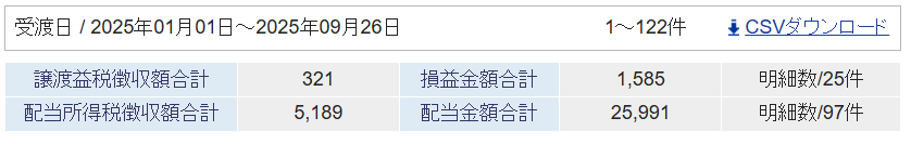 2025年の確定損益と配当金の受取額は以下の通りです。