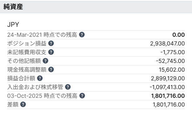 「損益合計額」の数値2,899,129円は、2021年3月25日からの累計の実現した損益と評価損益の合計金額です。