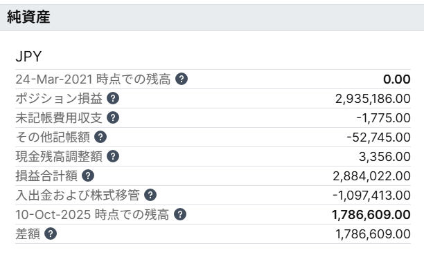 「損益合計額」の数値2,884,022円は、2021年3月25日からの累計の実現した損益と評価損益の合計金額です。