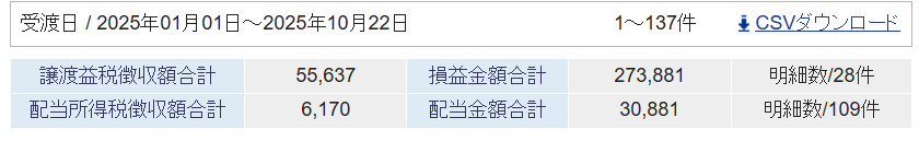 2025年の確定損益と配当金の受取額は以下の通りです。
