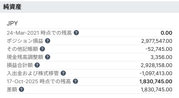 「損益合計額」の数値2,928,158円は、2021年3月25日からの累計の実現した損益と評価損益の合計金額です。
