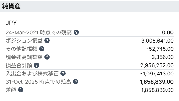 「損益合計額」の数値2,956,252円は、2021年3月25日からの累計の実現した損益と評価損益の合計金額です。