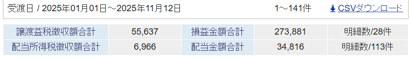 2025年の確定損益と配当金の受取額は以下の通りです。