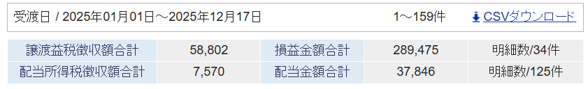 2025年の確定損益と配当金の受取額は以下の通りです。