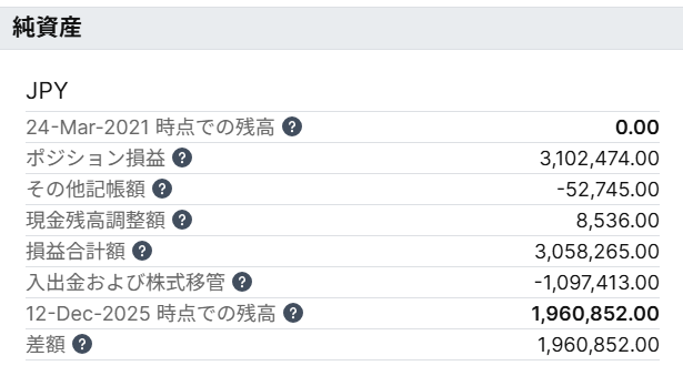 「損益合計額」の数値3,058,265円は、2021年3月25日からの累計の実現した損益と評価損益の合計金額です。