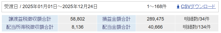 2025年の確定損益と配当金の受取額は以下の通りです。