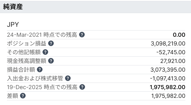 「損益合計額」の数値3,073,395円は、2021年3月25日からの累計の実現した損益と評価損益の合計金額です。