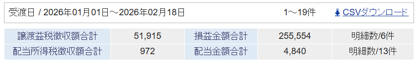 2026年の確定損益と配当金の受取額は以下の通りです。