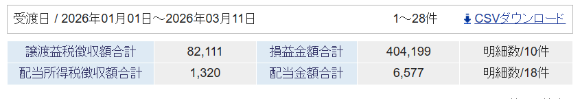 2026年の確定損益と配当金の受取額は以下の通りです。