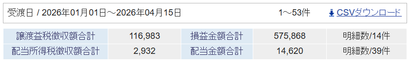 2026年の確定損益と配当金の受取額は以下の通りです。